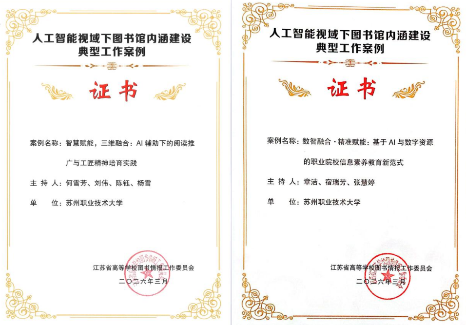 近日,由江苏省高等学校图书情报工作委员会指导、江苏省高校图工委高职高专图书馆建设专业委员会主办的“人工智能视域下图书馆内涵建设工作案例征集”结果公布。我校图书馆提交的两个案例入选典型案例,彰显了图书馆在AI赋能职教图书馆内涵建设、推动职教图书馆智慧化转型中的扎实实践与创新探索。